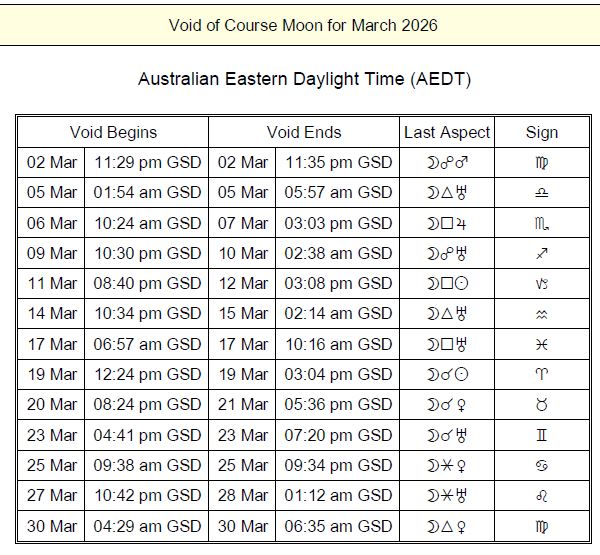 Void of Course Moon Table - March, 2026 AEDT